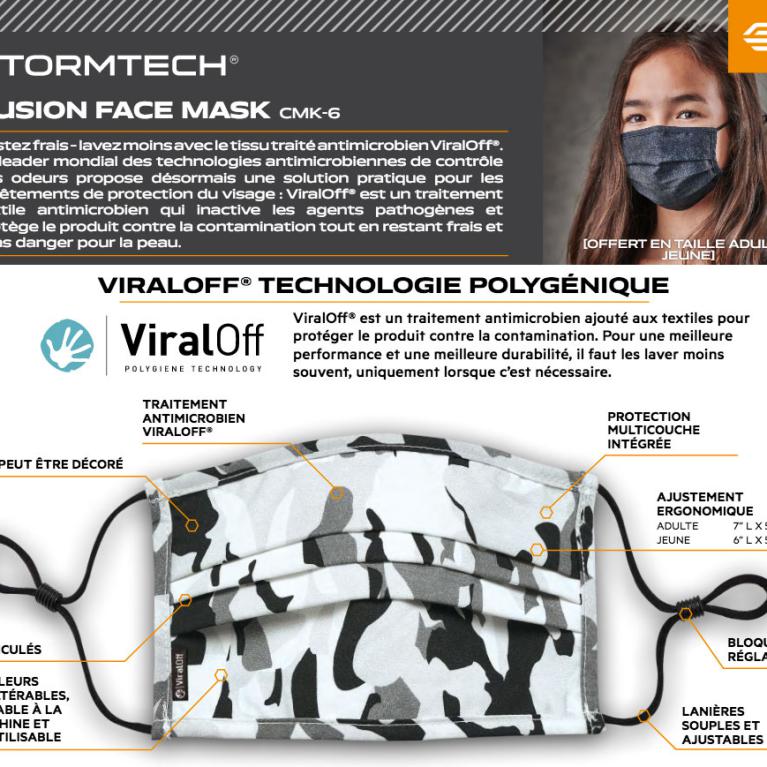 - Masque avec tissu traité antimicrobien ViralOff® qui détruit les virus en 2 heures.